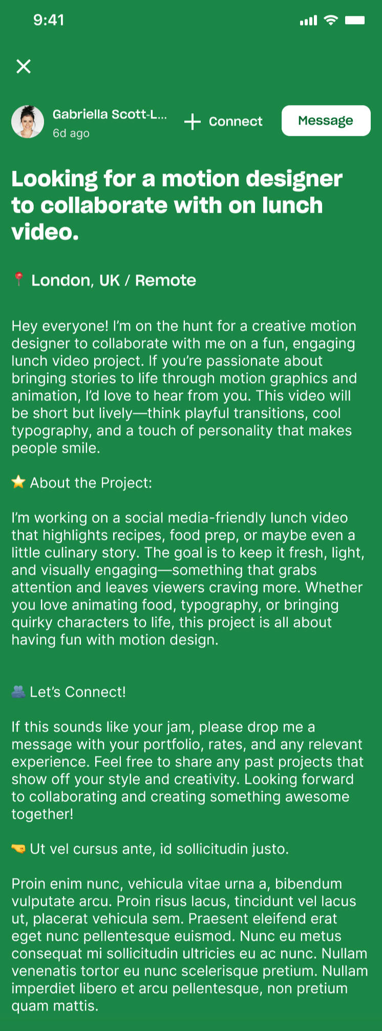 Discover projects that match your skills and passion. Post your own opportunities, connect with like-minded creatives, and collaborate on work that inspires you. Kinaborate makes finding the right partners simple and rewarding.
